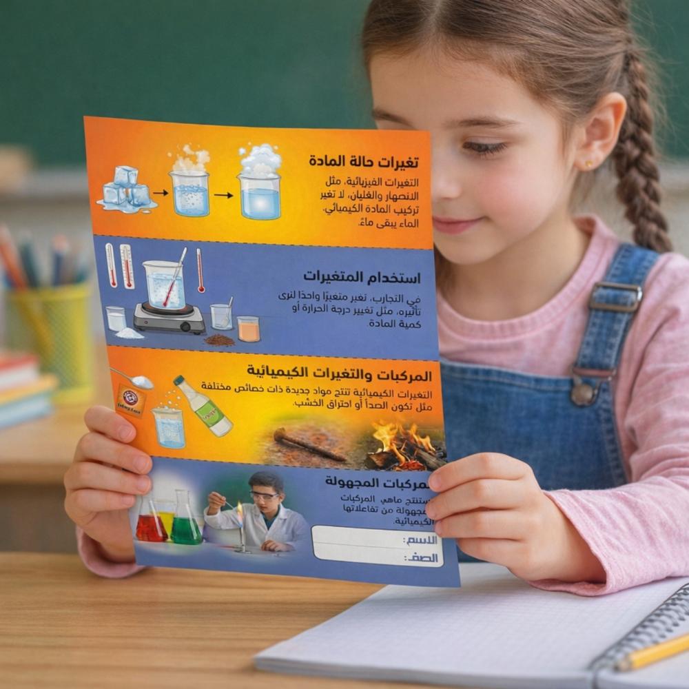 مطوية التغيرات الفيزيائية والكيميائية صف خامس ابتدائي النصف الثاني المطوية جاهزة بعد إتمام الدفع سينقلك لصفحة التحميل، قم بتحميلها وطباعتها، المطوية بصيغة PDF.